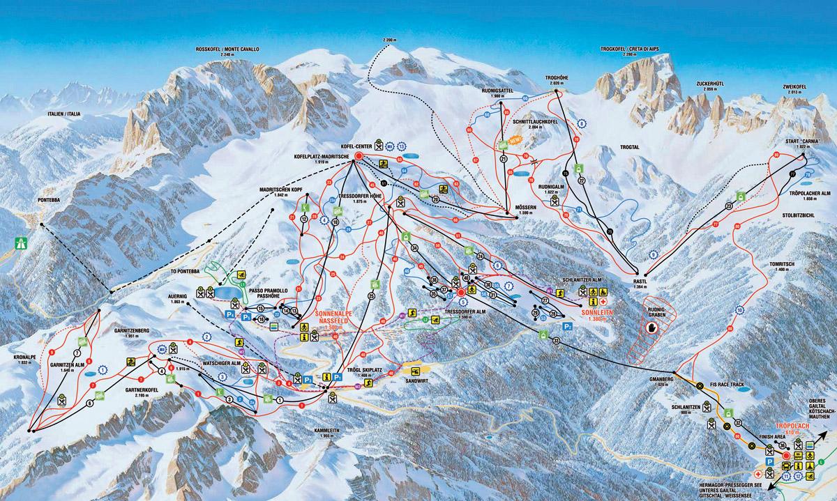 - najväčšie a najmodernejšie korutánske lyžiarske stredisko#- poloha priamo na talianskych hraniciach garantujúca spravidla tiež "talianske" prídely slnečných lúčov#- rozľahlý a otvorený areál prevažne strednej náročnosti svižne obsluhovaný lanovkami s vysokou prepravnou kapacitou#- výrazne zvýšená popularita Nassfeldu v posledných rokoch súvisiaca nielen s kvalitnou infraštruktúrou strediska, ale jednoznačne aj s rozmachom carvingu, freeridu a snowboardingu, pre ktoré tu panujú ideálne podmienky#- vďaka špecifickej mikroklímy mimoriadna istota kvalitnej prírodnej snehovej nádielky, a napriek tomu "pre istotu" celý skiareál kompletne pokrytý aj umelým zasnežovaním#- z auta komfortne rovno na zjazdovku#- rodinne vybavené ubytovacie zariadenie a množstvom atrakcií orientovaných na najmenších návštevníkov#- najdlhšia kabínková lanovka v Alpách - Millenium-Express z Tröpolachu s prevýšením 1.300 metrov#- pre ambicióznych jazdcov rýchlostná trať s meraným úsekom pod Troghöhe alebo svah s hrboľmi na Gartnerkofele#- vynikajúci snowpark činí Nassfeld rajom vyznávačov širokých dosiek#- celé 2,2 km z celkových 7,6 km dĺžky zjazdovky Carnia určené pre nočné lyžovanie, čiže najdlhšia osvetlená pista v Európe#- skvelé après ski programy, nočné sánkovanie, jazdy na saniach ťahaných koňmi alebo 55 km v zime upravovaných ciest pre peších turistov čiže polyžiarska relaxácia pre každého podľa jeho gusta#- pokojné rodinné skiareály Kötschach-Mauthen a Weißbriach s rozumnou dojazdovou vzdialenosťou do Nassfeldu#- curling, korčuľovanie na 55 hektároch zamrznutého jazera Pressegger See alebo umelá horolezecká stena doplňujúca obraz skutočne aktívnej dovolenky#- 10 nových nabíjacích staníc pre elektromobily priamo na perkovisku pri lanovke Millenium-Express |