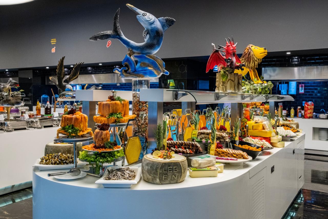 • Ultra all inclusive 07:00-10:00 snídaně formou bufetu, 10:00-11:00 pozdní snídaně formou bufetu, 12:30-14:30 oběd formou bufetu, 18:45-21:30 večeře formou bufetu, 22:000-02:00 noční občerstvení, 02:00-07:00 brzká snídaně - v hlavní restauraci